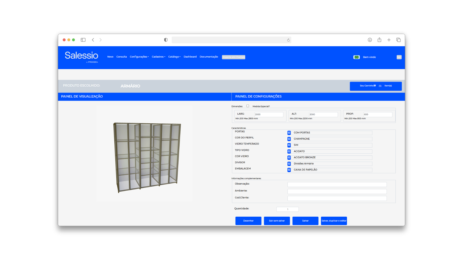 O Salessio é uma solução completa para o setor mobiliário, que reúne desde a configuração de produtos até a geração de orçamentos. Com ele, lojistas, vendedores e representantes conseguem montar produtos visualmente, configurar medidas, materiais e acabamentos. Além disso, em poucos passos, podem gerar orçamentos detalhados e sempre alinhados às regras do fabricante.